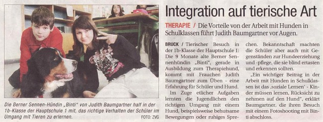 Therapiehündin Binti-Choice hat einen kleinen Zeitungsartikel in der NÖN bekommen |