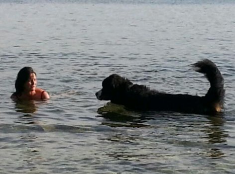 Kathrin mit ihren lebendigen Tommy, dem die Hitze (obwohl kurz bewölkt) nichts ausgemacht hat....Eddy und Holly waren gelassen.... der Weg geht ja direkt zum Wasser... |