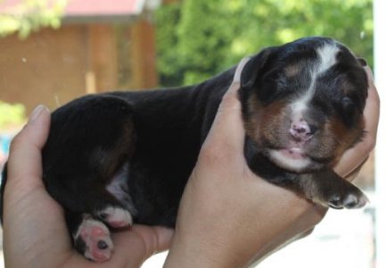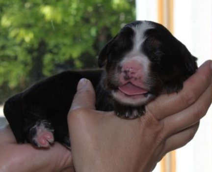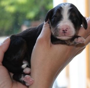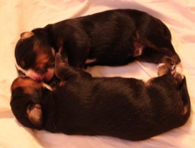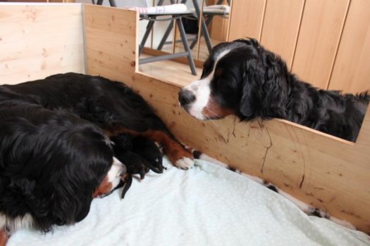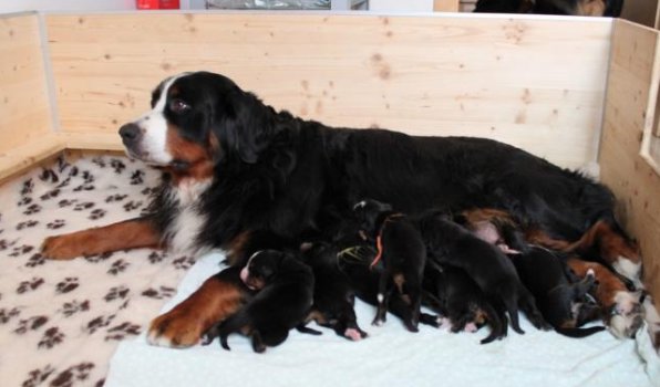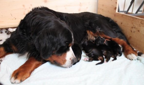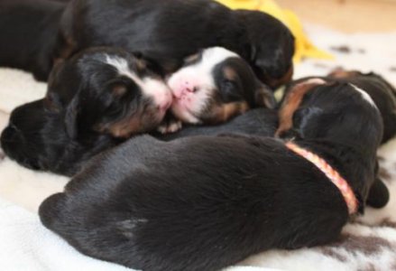Nun sind die Zwerge schon 1 Woche alt und Mama Feli hegt und pflegt die Welpen mit professioneller Ruhe und Liebe, dass die Kleinen ausgeglichen und mit vollen Bäuchlein den ganzen Tag verschlafen.... Eddy hat sich als Wächter vor der Wurfkiste wieder bereit erklärt und hofft schon auf den ersten Reinigungseinsatz.... |